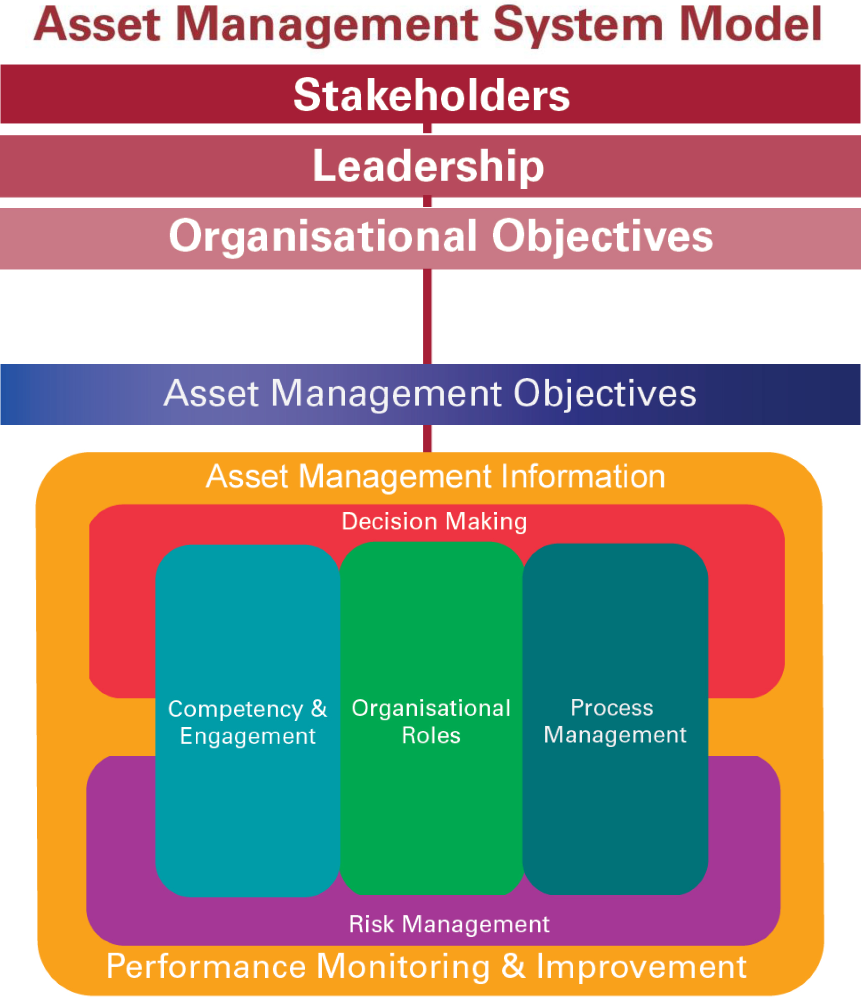 The Asset Management System is the management system used to manage an organisation’s assets and asset-related capabilities. An Asset Management System typically includes the following elements: